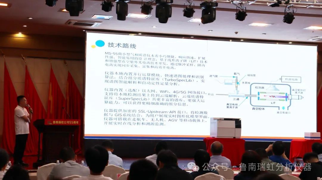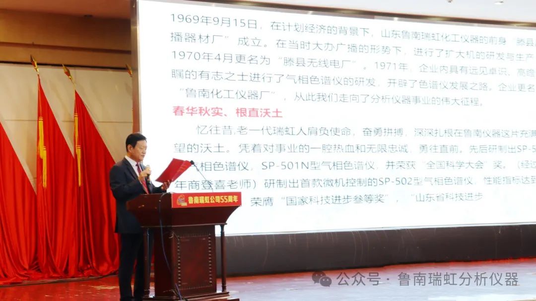活動由中國科學(xué)院空天信息創(chuàng)新研究院研究員馬天軍主持。伴隨著激昂的樂曲,公司董事長孔繁巖登臺致辭,他首先代表公司向現(xiàn)場的各級領(lǐng)導(dǎo)、各界人士,表示熱烈的歡迎和衷心的感謝!他指出山東魯南瑞虹化工儀器有限公司走過了五十五年風(fēng)雨歷程,在改革開放的巨浪中抓住機遇,以市場需求為導(dǎo)向,積極開拓新領(lǐng)域。特別是面對三年疫情,在經(jīng)濟環(huán)境相對惡劣的情況下,針對市場變化,優(yōu)化產(chǎn)品,物聯(lián)互通,智能運用,贏得了市場,銷量屢創(chuàng)新高。魯南瑞虹以振興國產(chǎn)儀器為己任,以引領(lǐng)色譜技術(shù)創(chuàng)新,持續(xù)為客戶創(chuàng)造價值為使命。打造中國色譜儀器高端品牌!向百年目標(biāo)奮進!