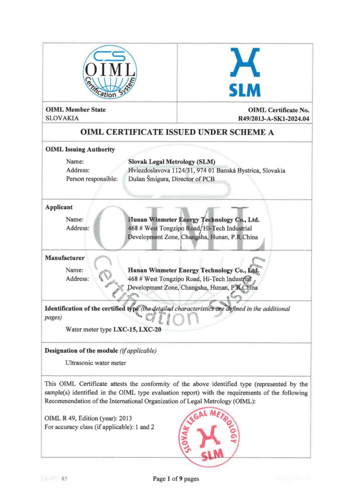 斯洛伐克法定計量(SLM)是全球公認的水計量型式認可機構。SLM是永久提供高品質和經濟實惠的計量服務,并頒發MIDOIML證書。這些證書被世界各地的公用事業公司廣泛要求,以確保供應的產品具備各種工況下的長期準確性。