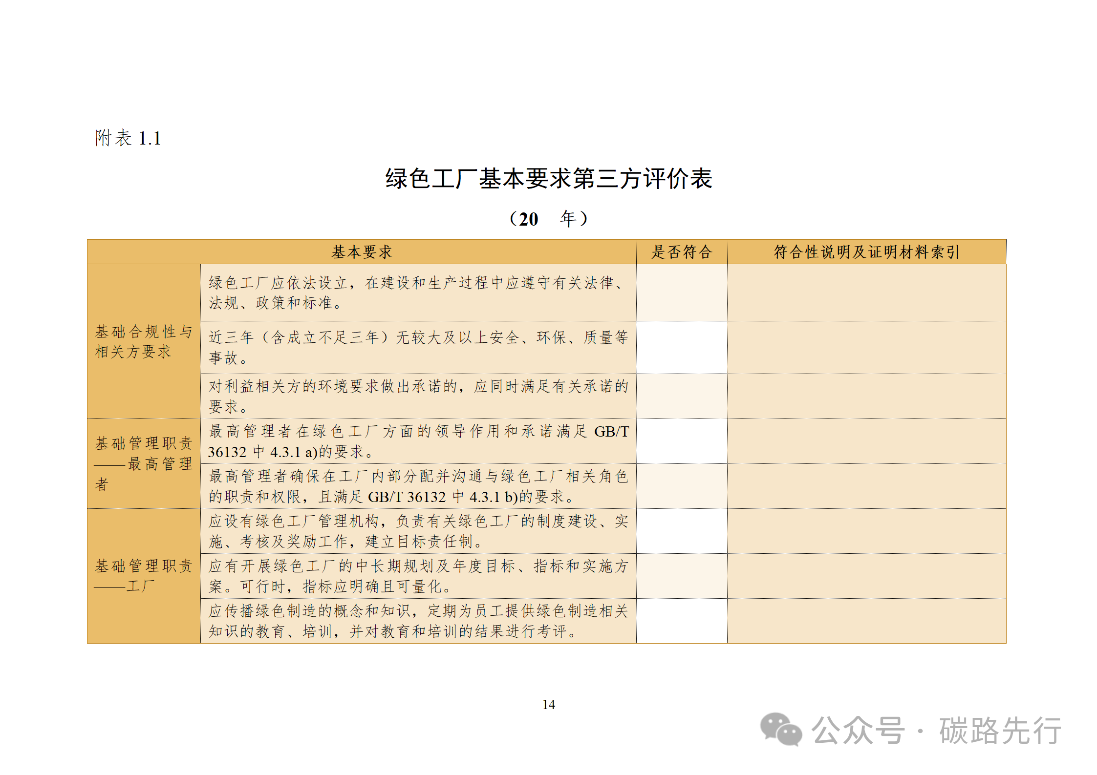 ①綠色工廠基本要求的符合情況;②6個一級指標(biāo);③加分項(xiàng):“零碳”工廠創(chuàng)建方面開展的工作情況。