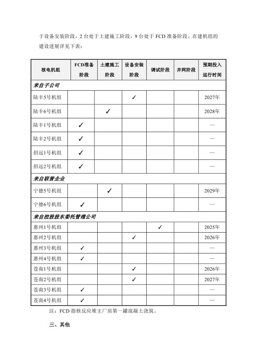 中國廣核表示,截至2024年9月30日,本集團共管理16臺已核準待FCD及在建核電機組(包括本公司控股股東委托本公司管理的8臺機組),1臺處于調試階段,4臺處于設備安裝階段,2臺處于土建施工階段,9臺處于FCD準備階段。在建機組的建設進展詳見下表: