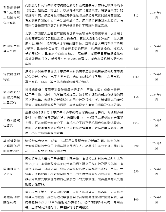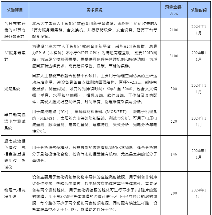 近日,北京大學發布28項儀器設備采購意向,預算總額達1.86億元,涉及含半自動高低溫電學測試系統、超高效液相色譜儀、氣相色譜質譜聯用儀、電感耦合等離子體化學氣相沉積系統等,預計采購時間為2024年11月。