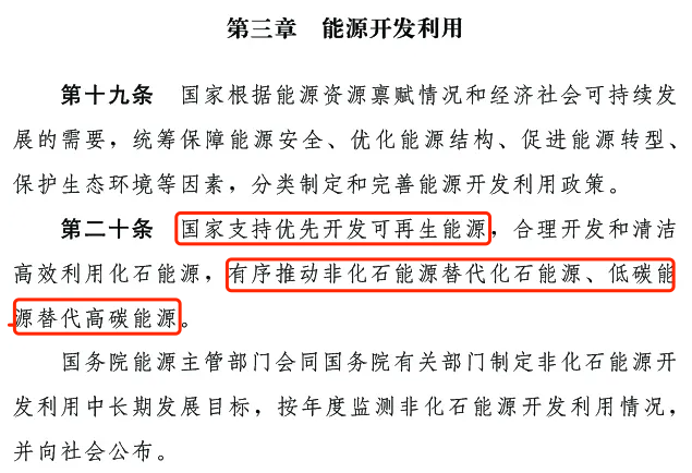 第二十條:國家支持優先開發可再生能源,合理開發和清潔高效利用化石能源,有序推動非化石能源替代化石能源、低碳能源替代高碳能源。國務院能源主管部門會同國務院有關部門制定非化石能源開發利用中長期發展目標,按年度檢測非化石能源開發利用情況,并向社會公布。