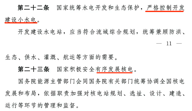 第二十二條:國家統籌水電開發和生態保護,嚴格控制開發建設小水電。