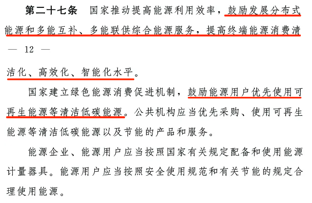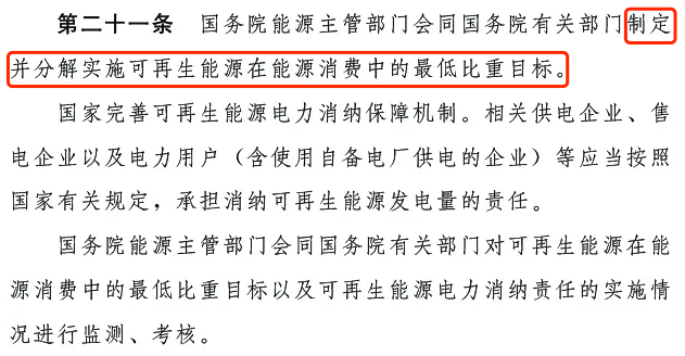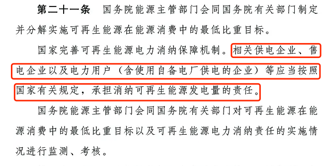 第二十一條:國家完善可再生能源電力消納保障機制。相關供電企業、售電企業以及電力用戶 (含使用自備電廠供電的企業)等應當按照國家有關規定,承擔消納可再生能源發電量的責任。國務院能源主管部門會同國務院有關部門對可再生能源在能源消費中的最低比重目標以及可再生能源電力消納責任的實施情況進行監測、考核。