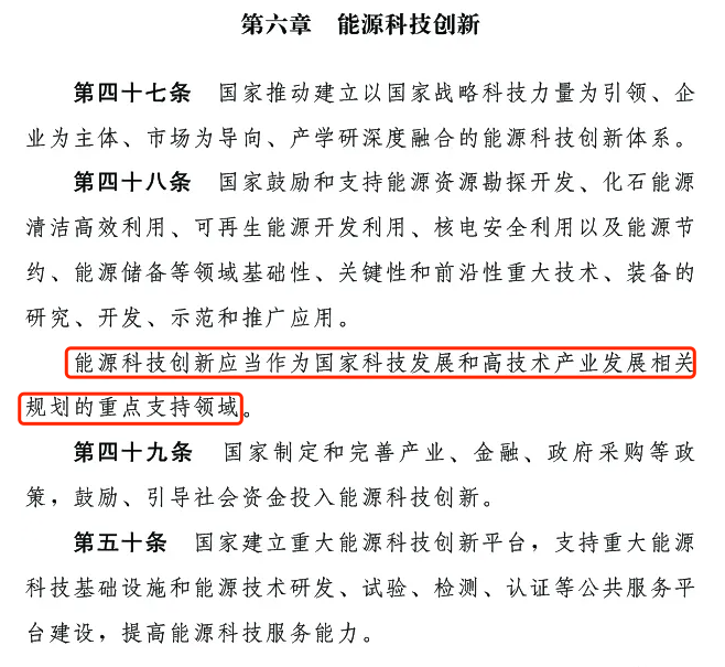 118日,十四屆全國人大常委會第十二次會議表決通過《中華人民共和國能源法》。這部法律共九章,主要內容包括總則、能源規劃、能源開發利用、能源市場體系、能源儲備和應急、能源科技創新、監督管理、法律責任、附則等,自202511日起施行。