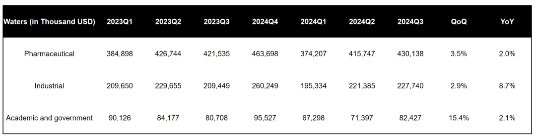 Waters2024Q3財(cái)報(bào)顯示,公司本季度營收7.40億美元,超過此前指引,同比增長4%。凈利潤1.615億美元,同比大增20%。值得注意的是,根據(jù)Waters財(cái)報(bào),2024Q1/Q2期營收均同比下滑,尤其是Q1更是大幅下降。