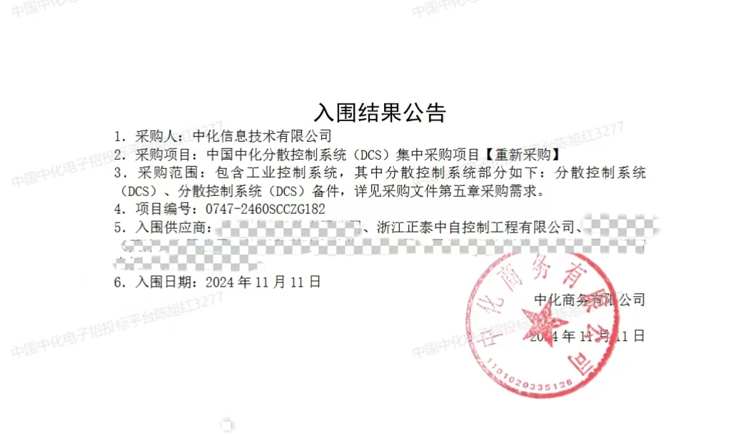 近日,中國中化分散控制系統(tǒng)(DCS)集中采購項目入圍結果公告發(fā)布,正泰中自提供的自產(chǎn)軟硬件和服務、安全柵、第三方產(chǎn)品成功入圍,被中化確定為入圍供應商。