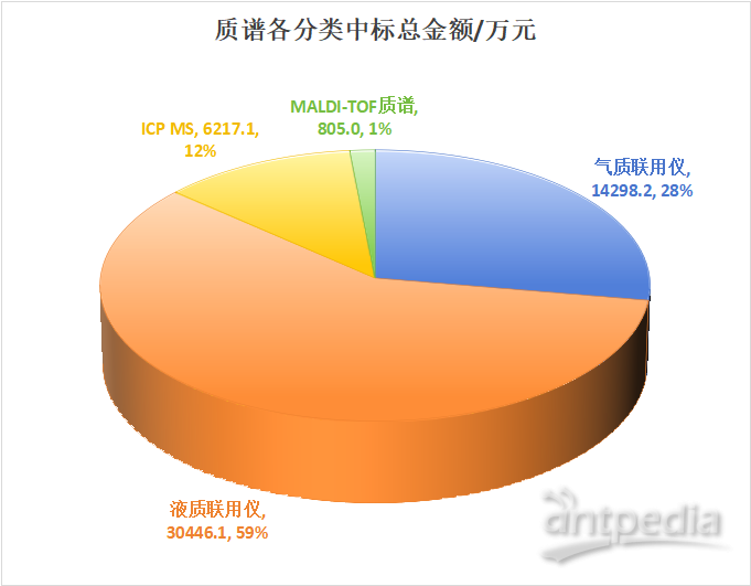 盡管氣質(zhì)聯(lián)用儀在中標(biāo)數(shù)量上略勝一籌,但從中標(biāo)總金額來看,液質(zhì)聯(lián)用儀以超過3億元的中標(biāo)金額占據(jù)了質(zhì)譜總中標(biāo)金額的59%,顯示出其在高端市場的強(qiáng)大競爭力。氣質(zhì)聯(lián)用儀的中標(biāo)金額為1.4億元,占總金額的28%,ICP MS的中標(biāo)金額為6217.1萬元,MALDI-TOF質(zhì)譜的中標(biāo)金額為805.0萬元。