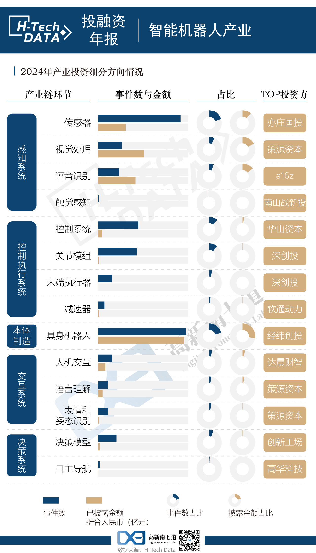 細分來看,機器人本體制造環節投資事件數量和金額最多,而感知系統緊隨其后,其中傳感器在感知系統中投資事件和金額占絕大多數,事件數量上,感知系統-傳感器、視覺處理、語音識別合計收獲66起融資,占比18.6%