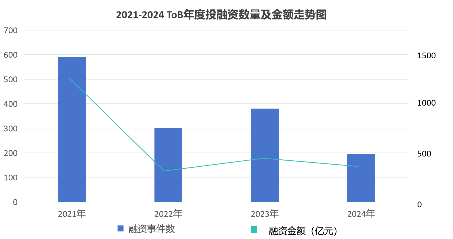 縱觀整個ToB軟件市場,技術支撐、垂直行業(yè)、工業(yè)軟件這三大類連續(xù)兩年保持為融資核心領域的TOP3。其中,2021年是近四年里的“融資高峰年”,隨后幾年進入調整期,2022年間無論融資數(shù)量還是金額大幅下滑,這與宏觀經濟環(huán)境、資本市場收緊及行業(yè)泡沫清理密切相關;2023年的回升顯示行業(yè)逐步走向理性,優(yōu)質項目開始重新受到資本青睞;2024年融資總額未見顯著復蘇,但行業(yè)資金更加聚焦于核心領域和頭部企業(yè)。