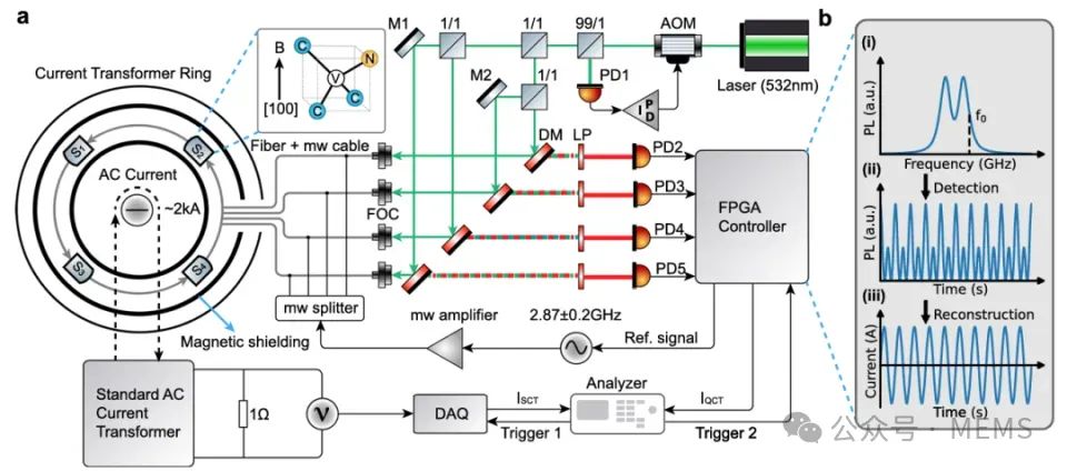 孫方穩(wěn)團隊長期開展金剛石量子傳感器件的加工制備研究,攻克了系列關(guān)鍵技術(shù)。為了解決電流測量難題,此次研究中團隊采用光纖-金剛石傳感器進行高壓電流測量,四個集成化金剛石量子傳感器均勻分布在磁屏蔽環(huán)中,其[100]晶向與交流磁場平行以提高信噪比。研究提出了在零偏置磁場下對熒光信號進行倍頻轉(zhuǎn)換和加權(quán)平均的處理方法,該方法能夠重構(gòu)50赫茲交流電的波形;同時,為了拓寬電流測量動態(tài)范圍,采用共振頻率跟蹤方法,保持金剛石傳感器對不同大小電流導致磁場變化的敏感性;針對實際應用中系統(tǒng)溫度變化影響測量精度的問題,通過雙頻量子控制方法可抑制溫度漂移;最后在0至1000安培范圍內(nèi)進行電流測量,將測量結(jié)果與標準電流互感器進行對比,實現(xiàn)了0.05%的測量精度。