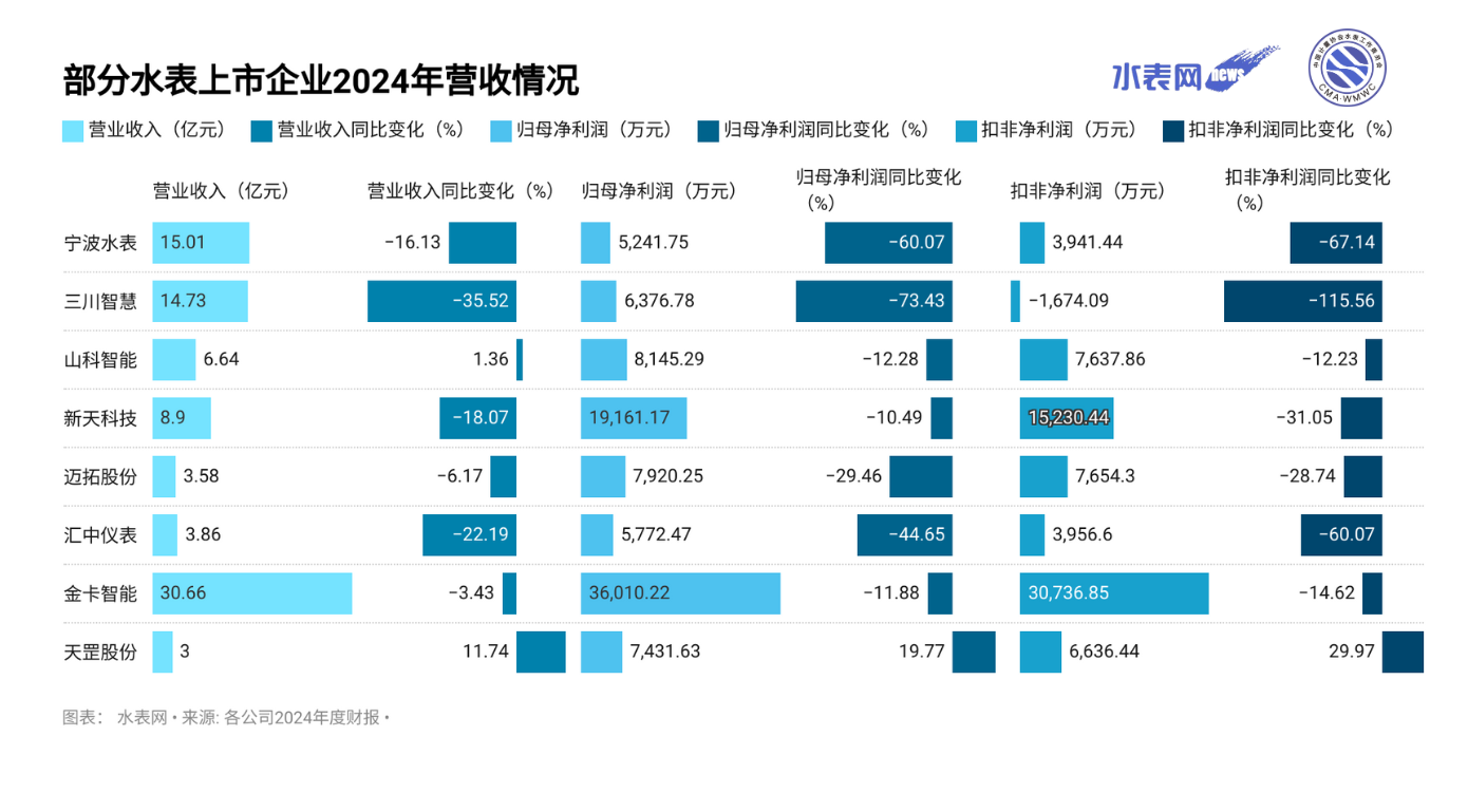 日前,多家水表上市企業(yè)發(fā)布2024年度財報。受宏觀經(jīng)濟波動、行業(yè)需求收縮及供應鏈成本上升等多重挑戰(zhàn)影響,行業(yè)內營收增長承壓,多家表企營業(yè)收入、凈利潤同比下滑。