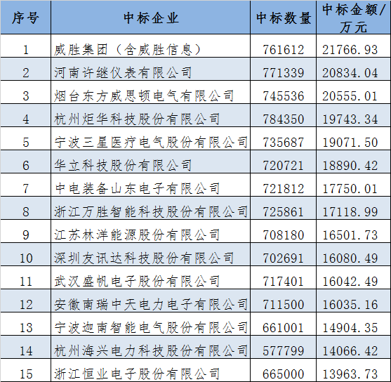 2025年度第一次招標電能表采集整體中標金額前15企業