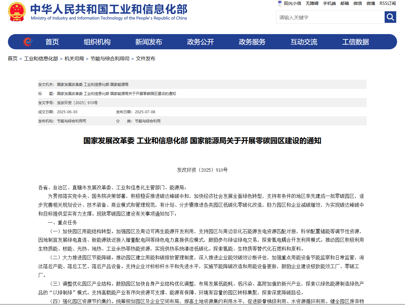 近日,國家發展改革委、工業和信息化部、國家能源局聯合印發《關于開展零碳園區建設的通知》,旨在全國范圍內推動一批條件成熟的園區率先開展零碳建設。
