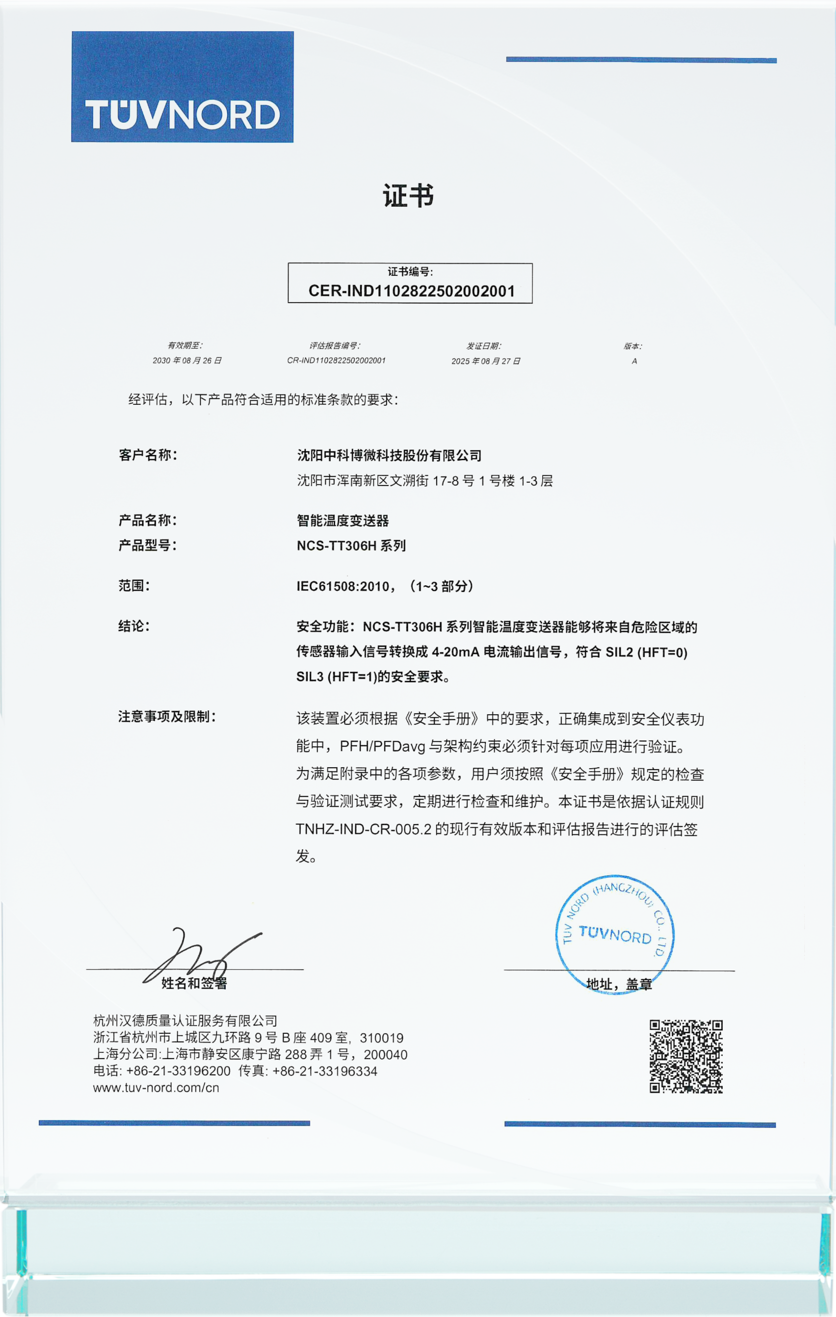 沈陽中科博微科技股份有限公司自主研發的NCS-TT306H智能溫度變送器通過TÜV測試,獲得功能安全SIL認證權威證書,安全等級達到SIL2SC3的要求。