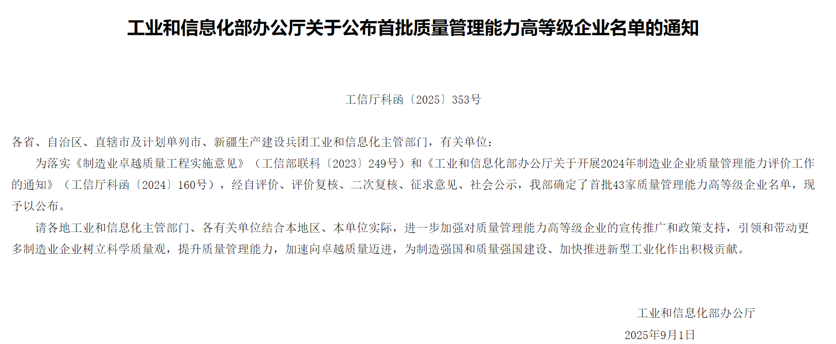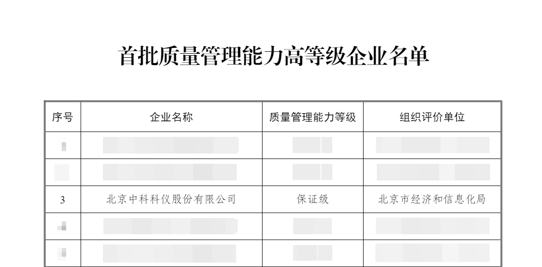 近日,工業(yè)和信息化部公布了首批43家質(zhì)量管理能力高等級企業(yè)名單,北京中科科儀股份有限公司成功入選。