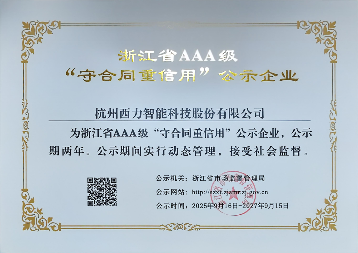 近日,浙江省市場(chǎng)監(jiān)督管理局公布了2025年度“守合同重信用”企業(yè)公示名單,公司憑借良好的合同履約記錄、完善的信用管理制度和規(guī)范的市場(chǎng)行為,獲評(píng)浙江省AAA級(jí)“守合同重信用”企業(yè)。