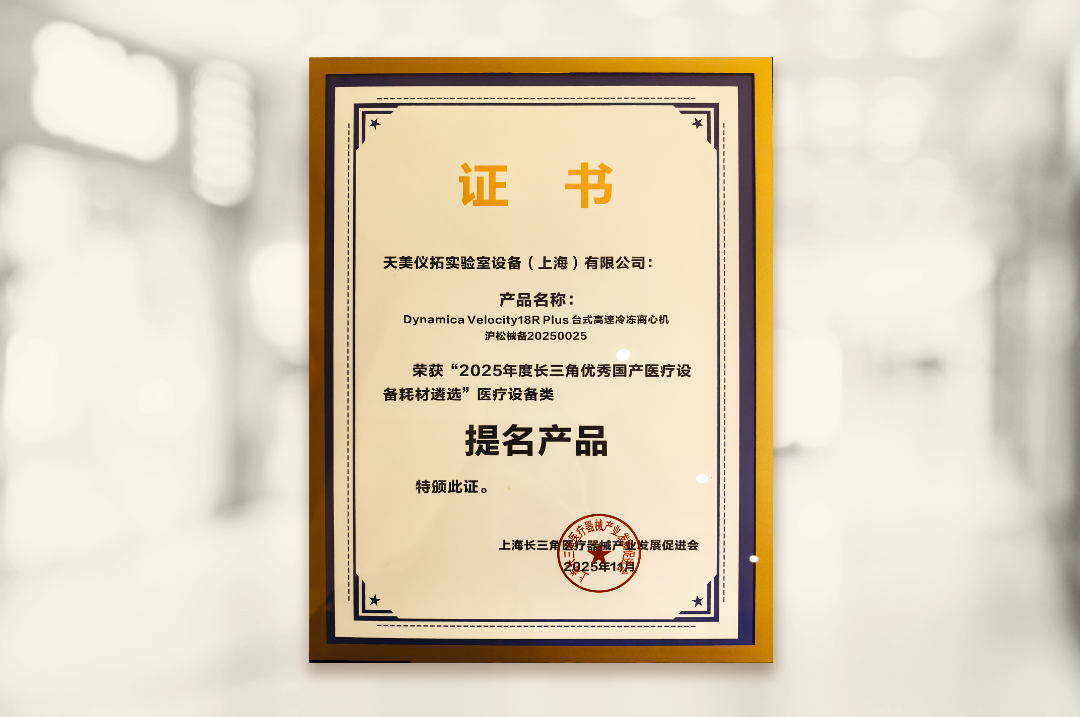 天美旗下Dynamica Velocity18R Plus臺式高速冷凍離心機從眾多國產(chǎn)設備中脫穎而出,榮獲“2025年度長三角優(yōu)秀國產(chǎn)醫(yī)療設備耗材遴選”醫(yī)療設備類提名產(chǎn)品。