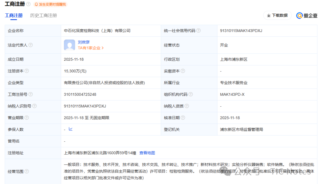 2025年11月18日,中石化深度檢測科技 (上海) 有限公司正式成立,注冊資金1.53 億,由中石化全資持股,經營范圍明確包含實驗分析儀器銷售、檢驗檢測服務。