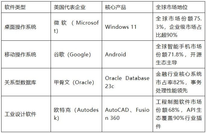 美國企業通過技術標準制定與生態構建形成雙重壟斷。微軟憑借.NET框架與DirectX技術體系,構筑Windows的開發者護城河;甲骨文數據庫以ACID特性與RAC集群技術,成為銀行核心系統的“標配”;SynopsysEDA工具鏈更是深度綁定全球半導體產業,形成“設計工具-制造工藝”的共生體系。歐洲企業在特定領域補充布局,如法國達索系統的CATIA軟件壟斷航空航天設計市場,德國西門子的PLM系統占據制造業數字化平臺35%份額。