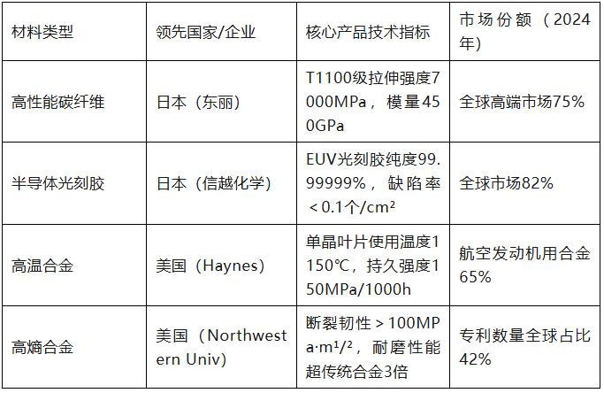 全球先進材料產業呈現“技術壁壘高筑、區域優勢分明”格局。日本依托精細化制造傳統,在電子化學品、特種纖維領域構筑技術護城河,東麗T1100碳纖維的強度指標比中國同類產品高30%;美國聚焦前沿材料創新,高溫合金、高熵合金等軍用轉民用技術領先全球,Haynes 282合金占據航空發動機燃燒室80%份額;德國則在結構材料領域保持優勢,蒂森克虜伯的熱作模具鋼壽命比中國產品高2-3倍。三國通過“材料研發-器件應用-標準制定”的閉環體系,持續鞏固領先地位。