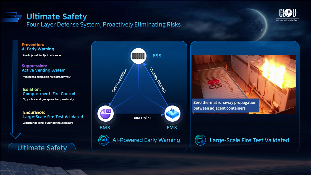 面對日本地震多發的地質特點,Aqua-C2.5系列滿足IEEE 693高抗震標準,可輕松應對當地抗震及運輸要求。系統還通過電芯故障告警、主動通風泄爆系統降低燃爆風險、獨立分倉滅火,以及長時耐火3小時以上設計構建四級安全防御體系,保障系統極致安全。
