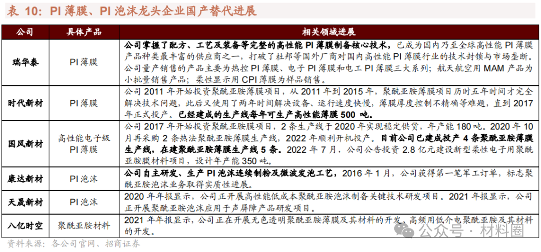 整體來看,雖然我國高等院校、研究所、多領域頭部公司已布局多種類型聚酰亞胺材料的研究開發工作。但是,在高性能、特種用途的聚酰亞胺材料制造方面,我國仍明顯落后于發達國家。