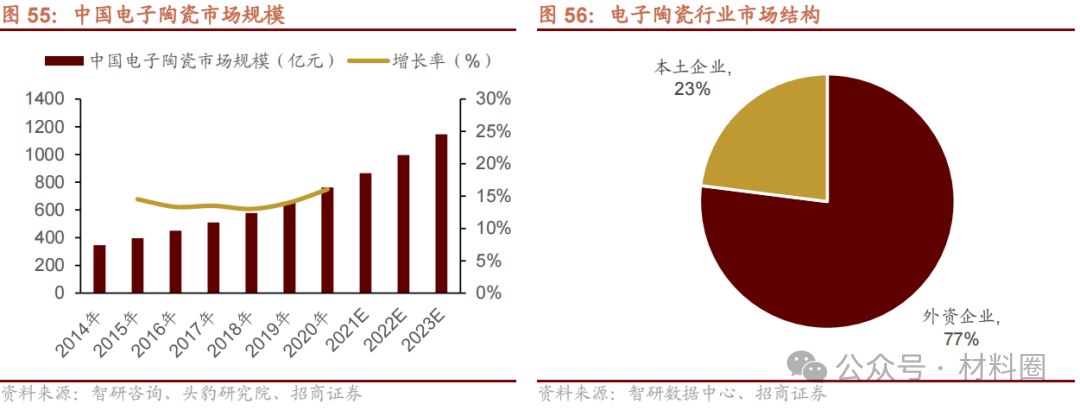 在下游光纖通訊、國防軍事等應用場景擴大及高速增長、下游利好國家政策的作用下,國內電子陶瓷市場規模由2014年的346.6億元增長至2019年的657.7億元,國內電子陶瓷企業向高端化、高附加值轉型升級的方向不斷推進。預計我國電子陶瓷市場規模億年復合增長率15%的速度在2023年達到1145.4億元。在市場結構上,與日本、美國電子陶瓷企業相比,我國電子陶瓷企業中低端產品依然占據主流。電子整機中很多技術含量高的陶瓷元器件仍然依賴進口,在市場規模、產品檔次與技術水平上依然存在一定差距。數據顯示,中國本土電子陶瓷企業在國內僅占據23%的市場份額,其余77%的市場份額仍被日本、美國等外資企業占據。