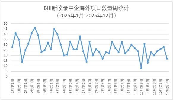 據(jù)BHI中企海外項目數(shù)據(jù)庫監(jiān)測,12月15日-19日BHI新收錄中企新簽約/中標(biāo)/公告海外項目17個,較此前有所回落。2025年新收錄項目超過1320個。近一年每周新收錄項目數(shù)量趨勢統(tǒng)計詳見下圖。
