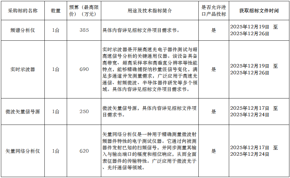 2025 年12月17日至12月19日,南開大學(xué)智能光子研究院在中國政府采購網(wǎng)連續(xù)發(fā)布四項招標(biāo)公告,預(yù)算金額1945萬元,涉及四款最高端的電子測試儀器:預(yù)算620萬元矢量網(wǎng)絡(luò)分析儀1臺、預(yù)算250萬元微波矢量信號源1臺、預(yù)算385萬元頻譜分析儀1臺、預(yù)算690萬元實時示波器1臺。