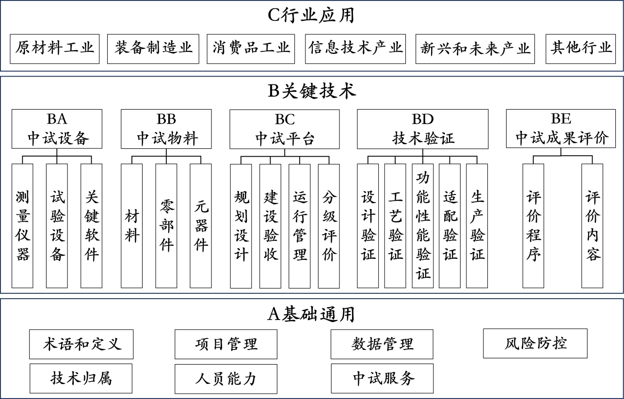 制造業(yè)中試標準體系結構包括基礎通用、關鍵技術、行業(yè)應用等3個部分,如圖1所示。其中,基礎通用標準規(guī)范制造業(yè)中試的通用性技術和要求,是制造業(yè)中試標準體系的底層支撐。關鍵技術標準規(guī)范制造業(yè)中試設備、物料、平臺、驗證、成果評價等要求,是制造業(yè)中試標準體系的核心內容。行業(yè)應用標準規(guī)范各行業(yè)中試的應用要求,確保中試活動在具體行業(yè)規(guī)范科學開展,是制造業(yè)中試標準體系的應用拓展。