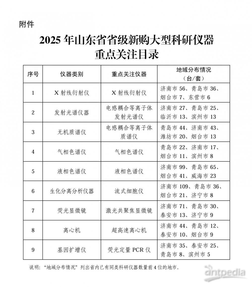 近日,山東省科學技術廳、山東省教育廳依托省大型科研儀器開放共享服務網數據,組織專家進行分析論證,對原值 50 萬元及以上大型科研儀器保有量、購置年限、使用績效、共享情況等核心指標進行定量分析與綜合研判,編制了《2025 年山東省省級新購大型科研儀器重點關注目錄》,X射線衍射儀、電感耦合等離子體發射光譜儀、電感耦合等離子體質譜儀、氣相色譜儀、液相色譜儀、流式細胞儀、激光共聚焦顯微鏡、超高速離心機、熒光定量PCR儀等9類儀器入選重點關注儀器。