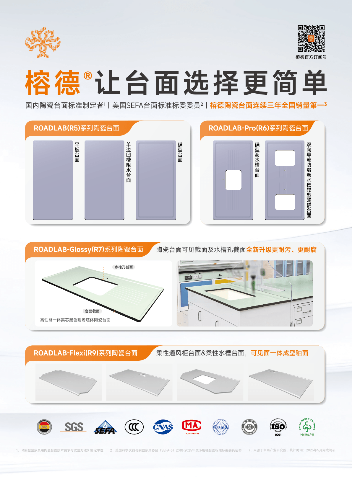 2025年推出的第七代(R7系列)高性能一體實(shí)芯黑色耐污坯體陶瓷臺面,針對陶瓷臺面可見截面及水槽孔截面全新升級,在耐污、耐腐蝕等關(guān)鍵性能上表現(xiàn)卓越,為全球科研空間提供了更優(yōu)質(zhì)的解決方案。
