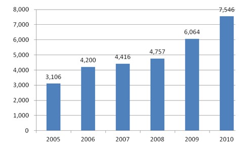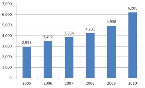 圖11:2005-2010我國家用電冰箱產量(萬臺)